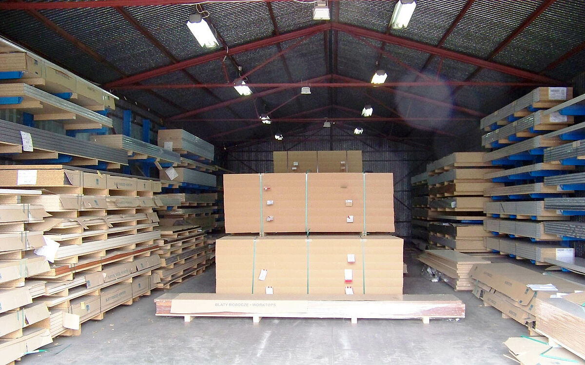 Za optimalen izkoristek skladiščne površine je poljsko podjetje Damar svoje skladišče opremilo s konzolnimi in paletnimi regali OHRA. Regalni sistemi ne omogočajo le preglednega skladiščenja ivernih, OSB in kuhinjskih delovnih plošč, temveč so tudi fleksibilno nastavljive – tako jih je možno individualno prilagoditi spreminjajočim se skladiščnim okoliščinam in situaciji poslopja.