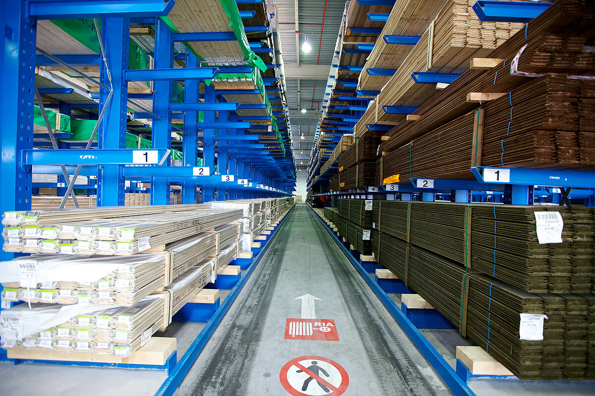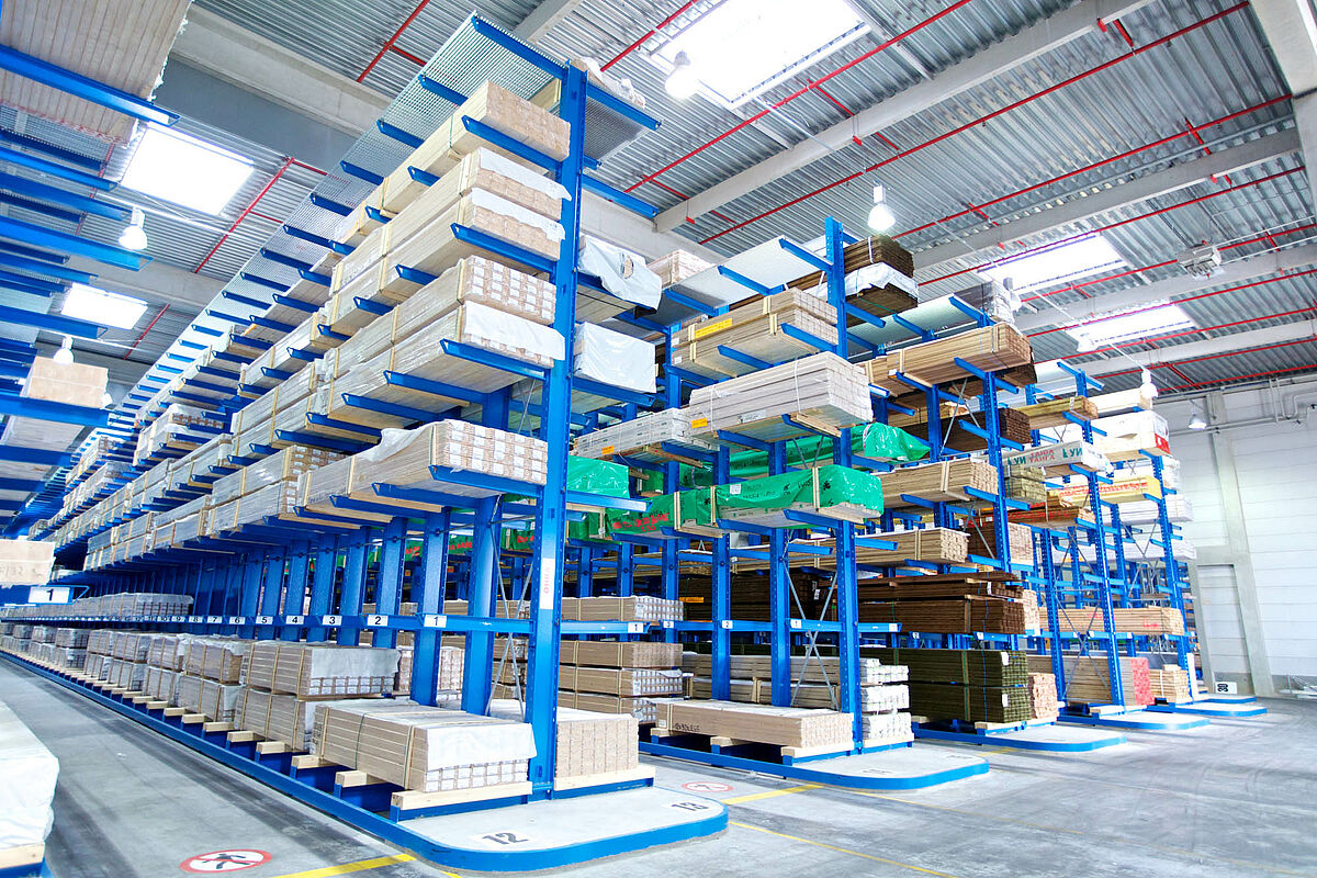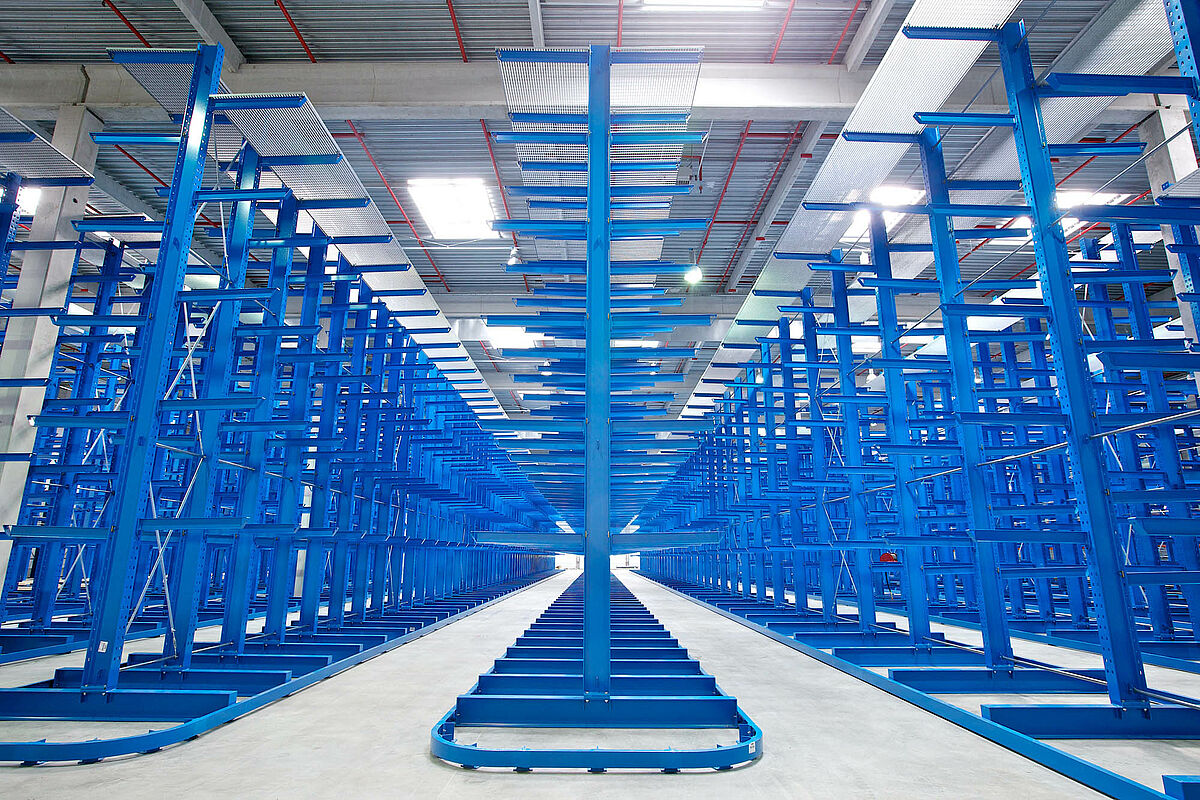 Tako so načrtovalci projekta po predstavah tehničnega oddelka trgovca z gradbenim materialom na eni strani predvideli regalno konzolo s 15 vrstami dolžine 75 m in višine 8 m na vrsto za skladiščenje dolgega tovora do 13 m in na drugi strani dodatnih 10 vrst z 8,5 m visokimi paletnimi regali, ki v dolžino prav tako merijo 75 m. Skupaj je bilo predvidenih 22 posameznih regalnih polic, od katerih je bilo 12 posameznih regalnih polic predvidenih v izvedbi ozkih konzolnih regalov. Za nakladanje in razkladanje so se odločili za večsmerne viličarje.