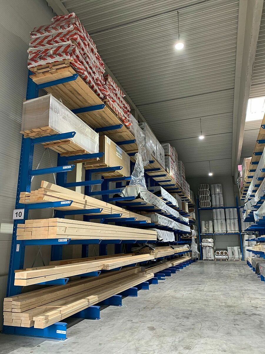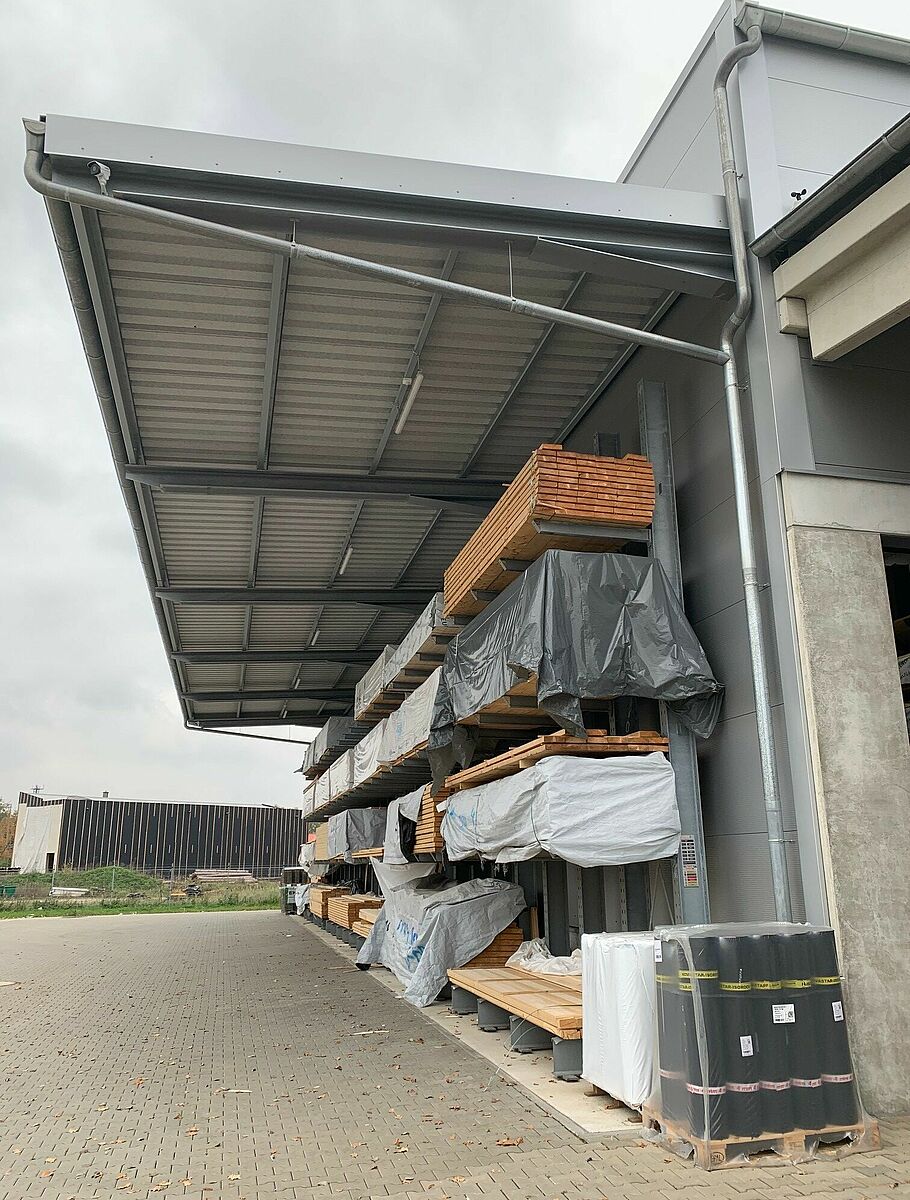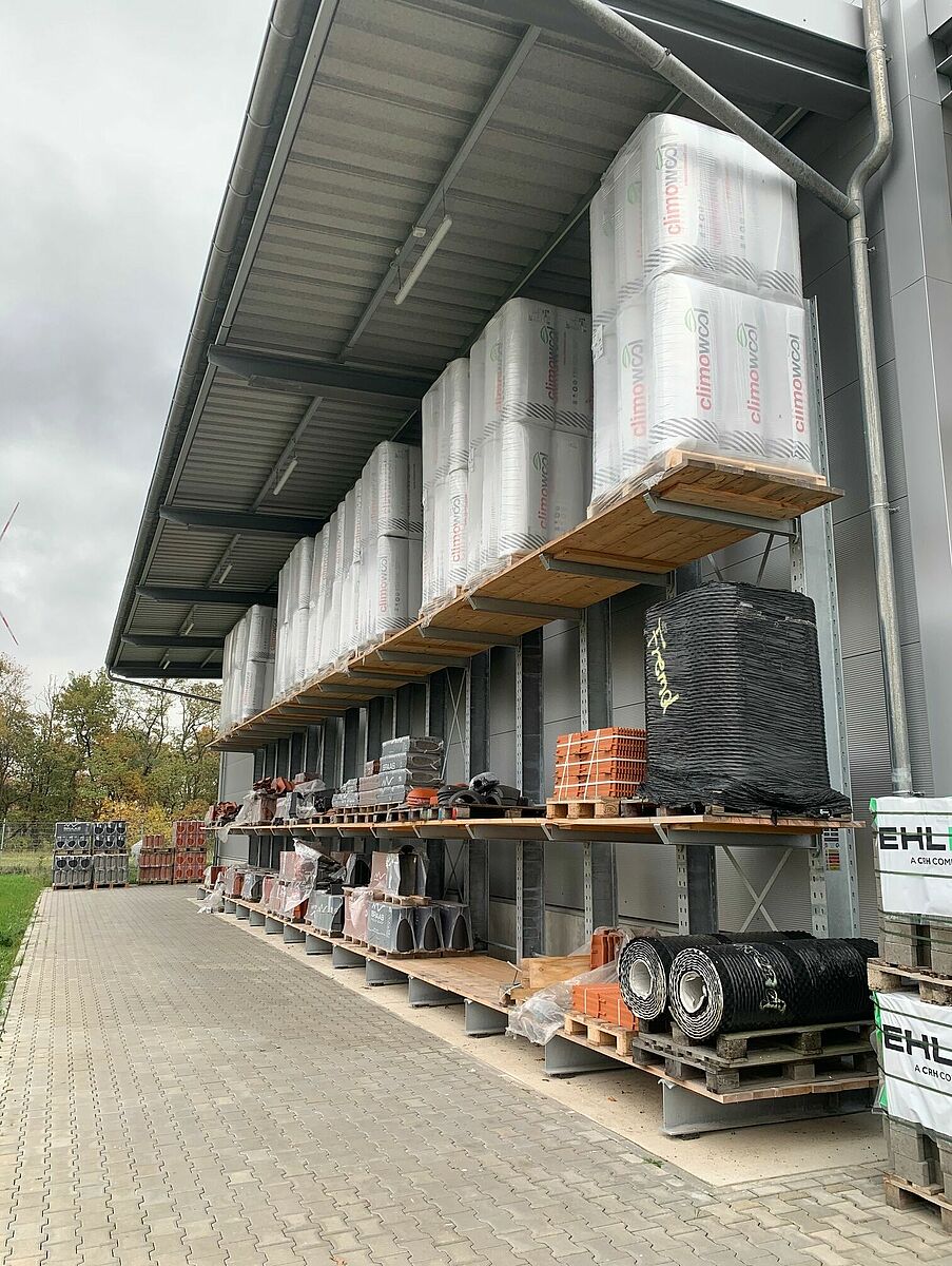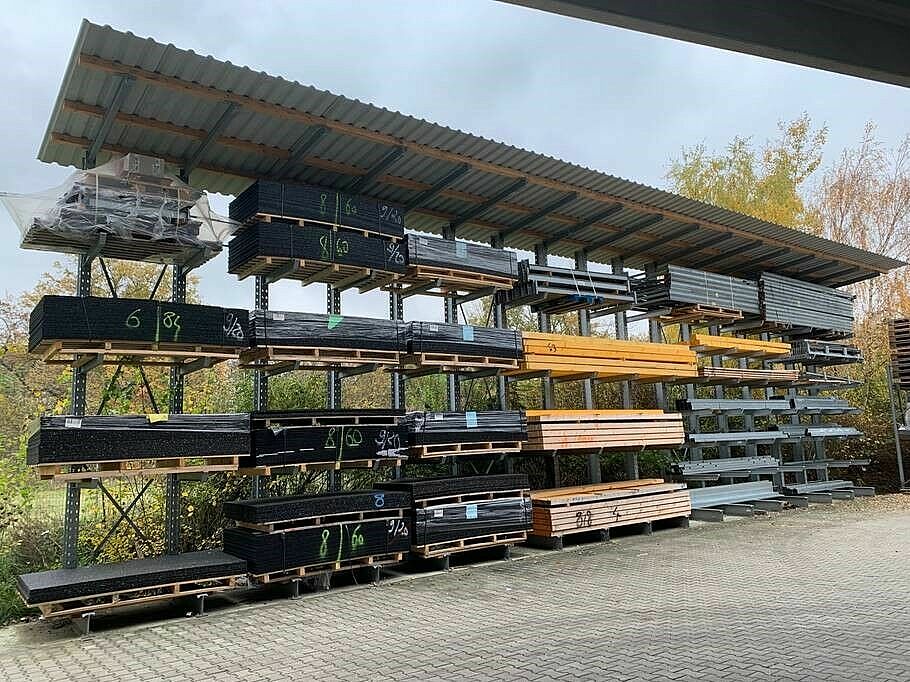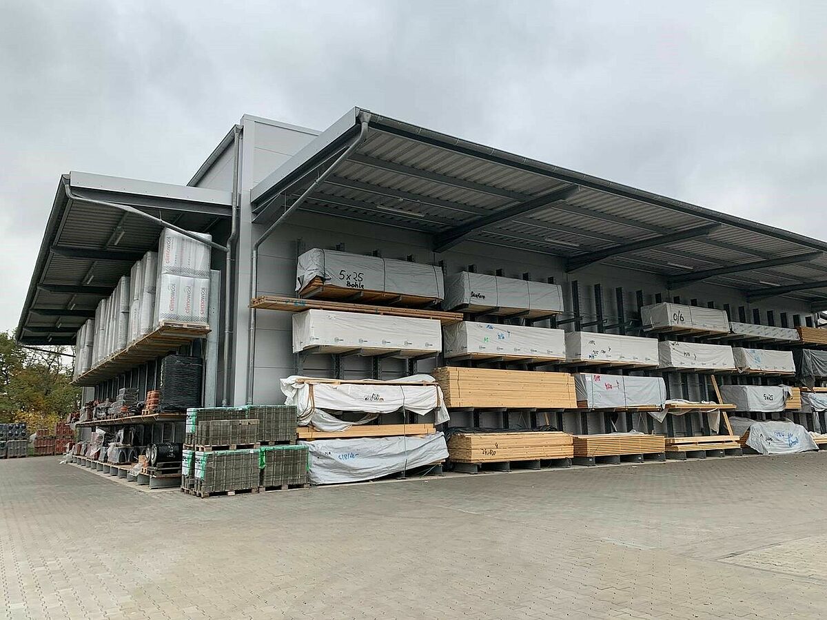 Nova, 12 metrov visoka skladiščna hala stoji na površini 1.000 kvadratnih metrov in ponuja dodatni prostor za nove artikle, na primer fasadne panele, izolacijske plošče in les za konstrukcije. Številni izdelki, ki so zdaj udobno in varno spravljeni v regalih, so bili prej skladiščeni na prostem in na tleh. Tako smo s paletnimi regali višine do 6,58 metra in konzolnimi regali višine do 7 metrov razširili skladiščne zmogljivosti in bistveno izboljšali dostop do blaga. Skupno je podjetje OHRA namestilo štiri približno 18 metrov dolge regalne vrste paletnih in konzolnih regalov, vzdolž notranjih sten hale pa dva 25,5 metra dolga konzolna regala s šestimi skladiščnimi ravnmi. Poleg tega so na prostem nameščeni še dodatni konzolni regali, ki skrbijo za shranjevanje neobčutljivega gradbenega materiala.