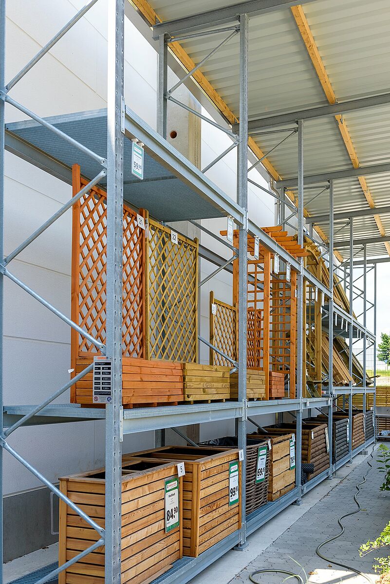 Za skladiščenje vrtnih in lesenih izdelkov se je podjetje Jos. Schneider odločilo za kombinacijo konzolnih in paletnih regalov dolžine do 48 metrov. Da bi lahko zagotovili trajno skladiščenje najrazličnejših izdelkov na konzolnih regalih, so vse ravni skladišča opremili z mrežastimi rešetkami. Uporaba jeklenih profilov s polnimi stenami na vseh nosilnih elementih omogoča regalom podjetja OHRA visoko nosilnost, profili pa se lahko ob udarcih elastično upognejo in trajno obdržijo statične lastnosti. Tako ponujajo tudi dolgotrajno osnovo za strehe in zidove.
