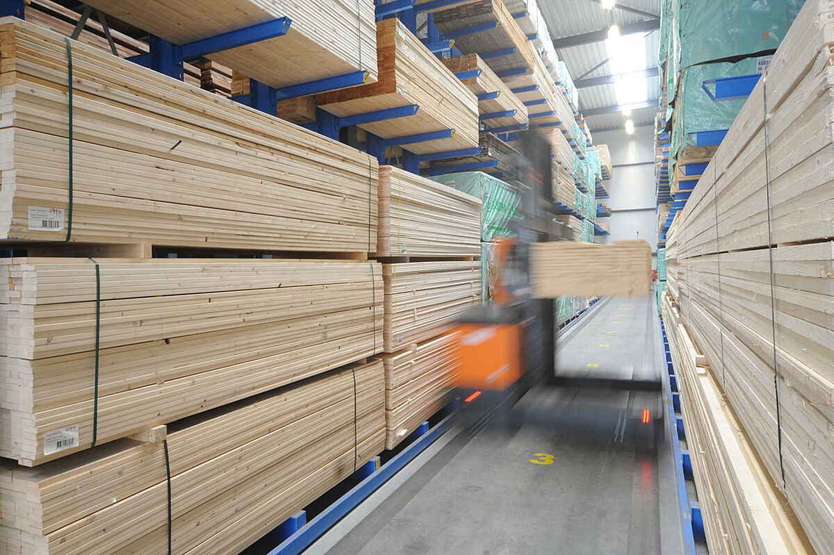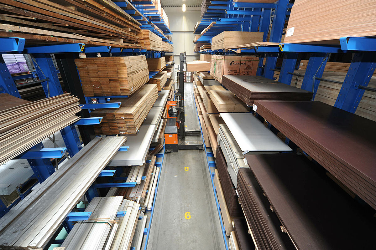 Za optimalno skladiščenje lesa, plošč in gradbenega materiala je podjetje OHRA v le dveh mesecih postavilo enajst 36 metrov dolgih vrst s konzolnimi regali in dve vrsti s paletnimi regali. Z 9 metrov dolgimi regali je razpoložljiv prostor najboljše možno izkoriščen in poti za štiripotne viličarje so se skrajšale. Paletni regali nudijo s širinami predalov 2.700 milimetrov na šestih nivojih skupaj 462 odlagališč. Konzolni regali omogočajo na devetih nivojih skladiščenje dolgega lesa; dolžina konzol variira med 1.100 in 1.550 milimetri. Ker podjetje ITS prodaja tudi trdi les, so nekatere regalne cone izvedene tudi kot regali za težka bremena.