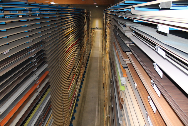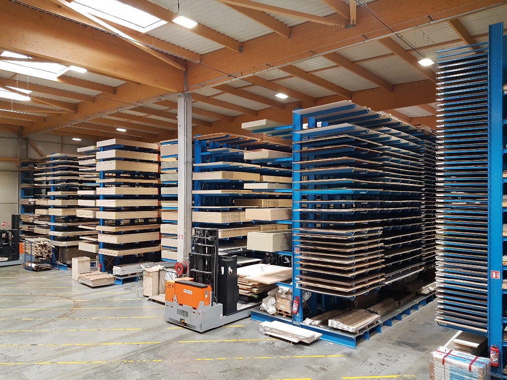 Podjetje OHRA je dodatno namestilo skladiščni oder, na katerega so zgoraj in spodaj nameščeni regali s predelki. V njih so na primer skladiščeni robni trakovi in okovja. Takšna razširitev skladiščnih površin za eno etažo omogoča optimalno izrabo razpoložljivega prostora.