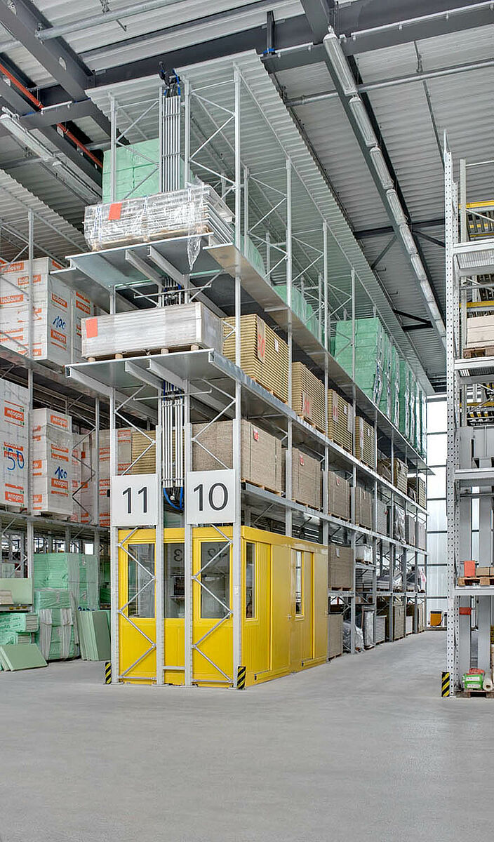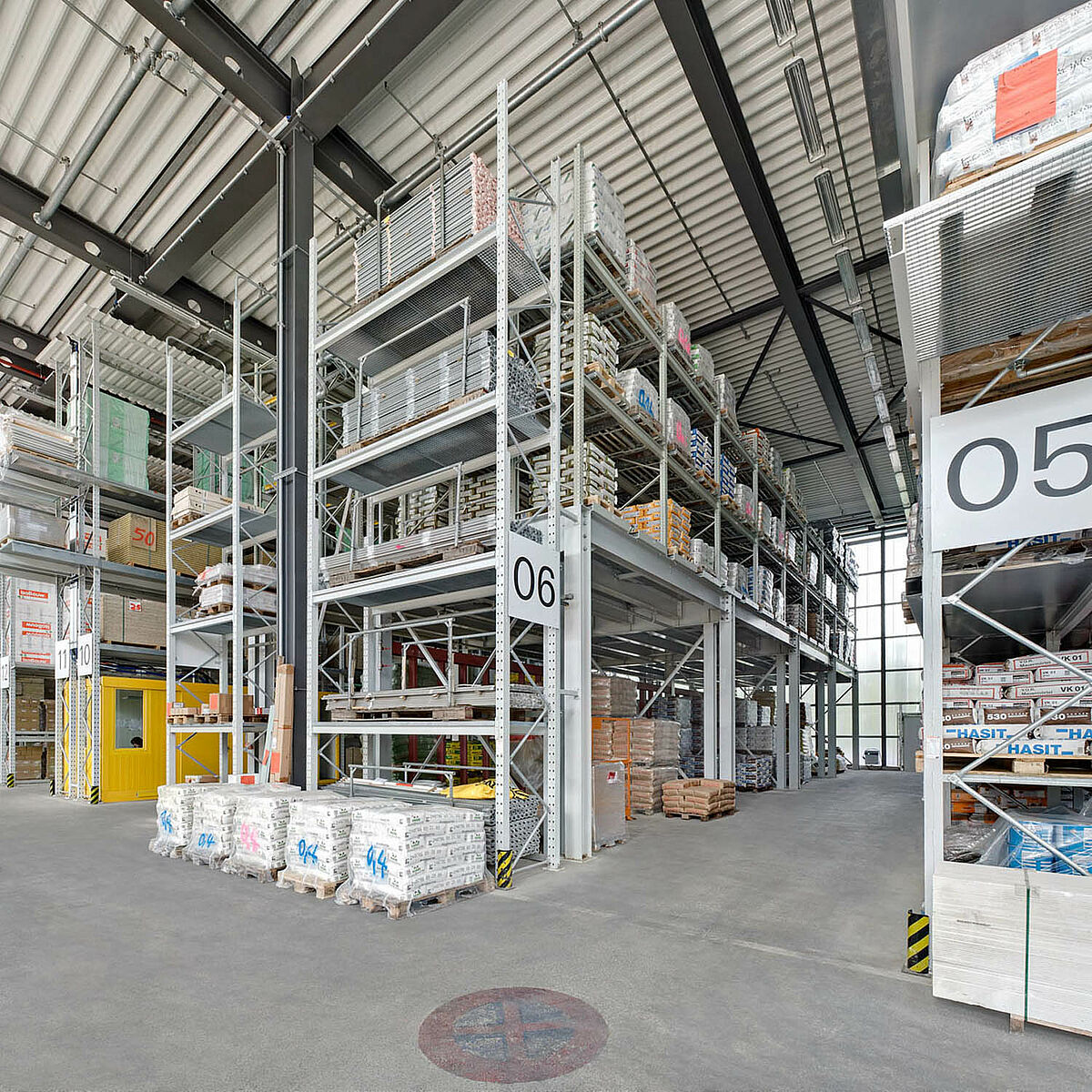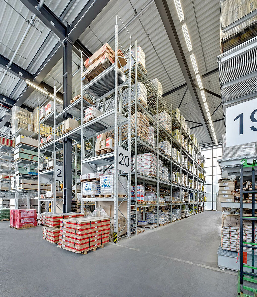 Gradbeni material na paletah se skladišči v robustnih OHRA paletnih regalih na prostem, kot tudi v notranjih prostorih. V posameznem regalnem polju z svetlo dolžino 2.900 mm, sa lahko vskladiščijo tudi palete z čez rob štrlečim materialom. Na čelni strani paletnega regala se je dodala sprejemna postaja za enostavno in učinkovito komisioniranje. Nadalje so se lahko v paletne regale zaradi velike nosilnosti nosilnih okvirjev vgradili posamezni zabojniki.