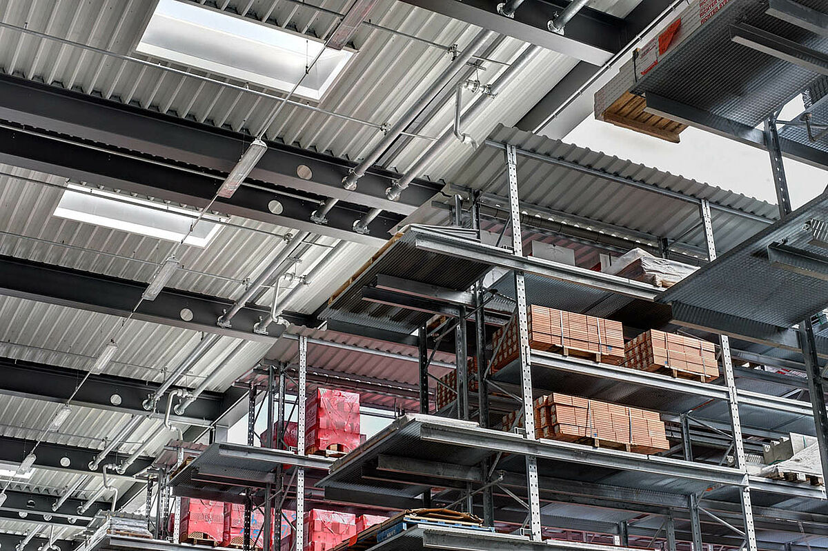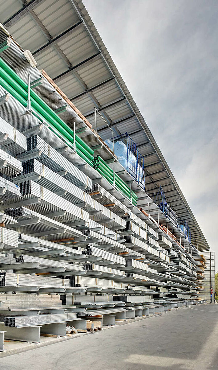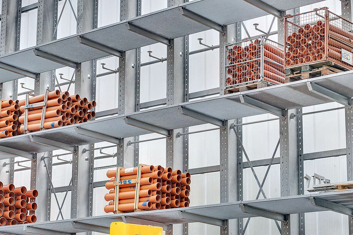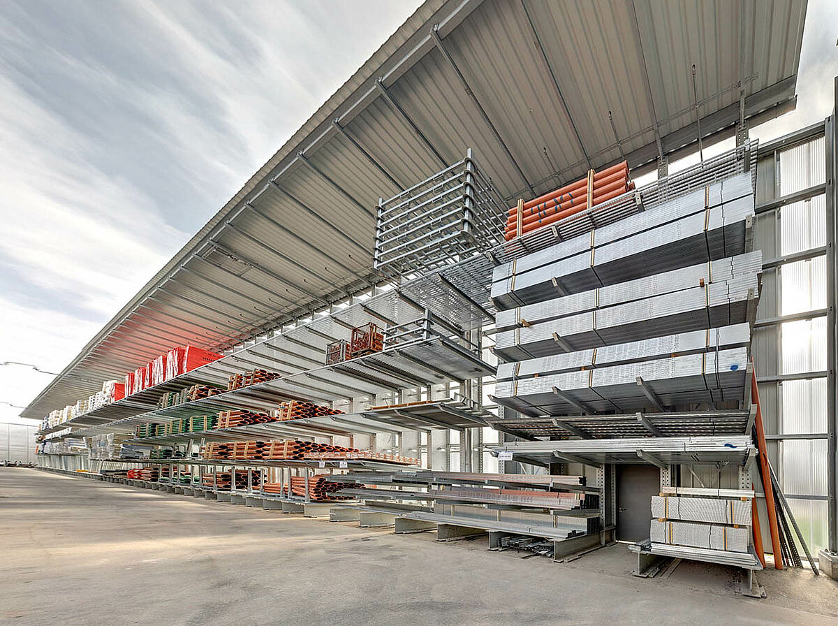 Tako so se npr. za zunanji prostor dobavili konzolni regali, zaščiteni z vročim cinkanjem. V regalih so našli svoj prostor vsi proizvodi kot npr. KG cevi, betonske plošče ali lesene deske. Konzolni regali so deloma pokriti in opremljeni z nosilnimi kovinskimi rešetkami. V tem primeru je bila tudi posebna zahteva po bočni poševno padajoči strešni konstrukciji zaradi poteka zemljišča.