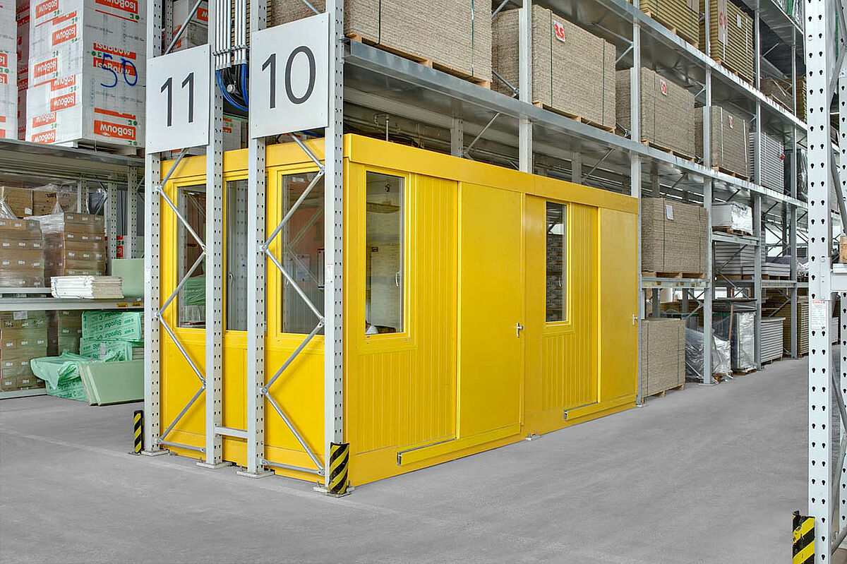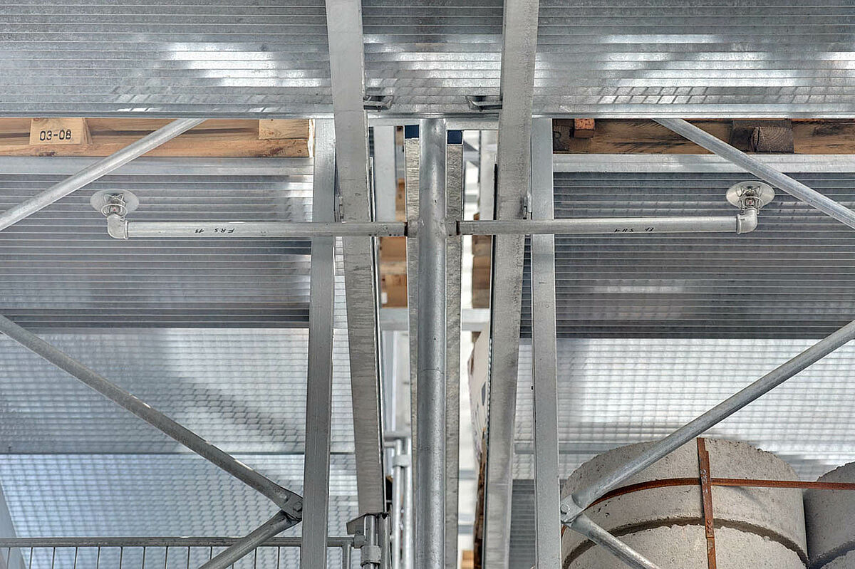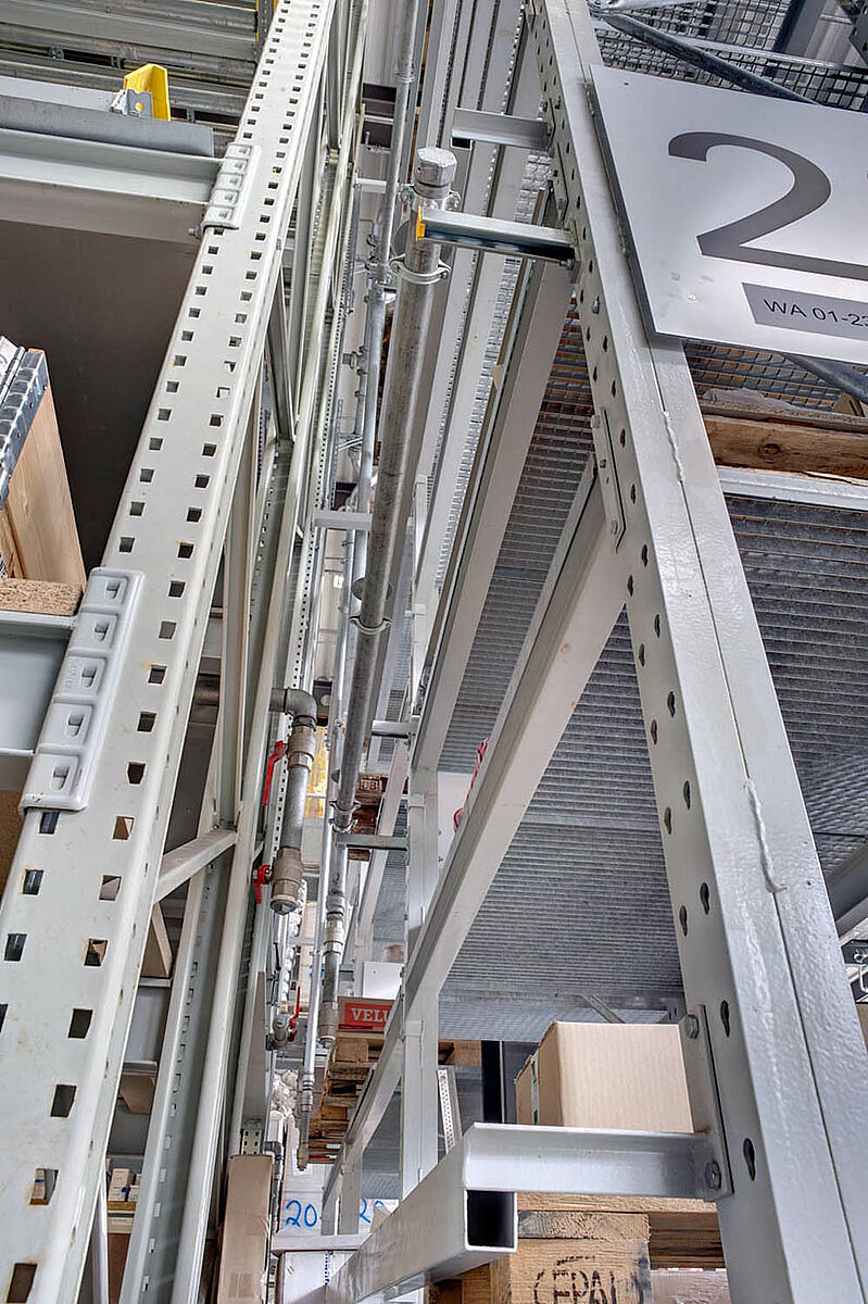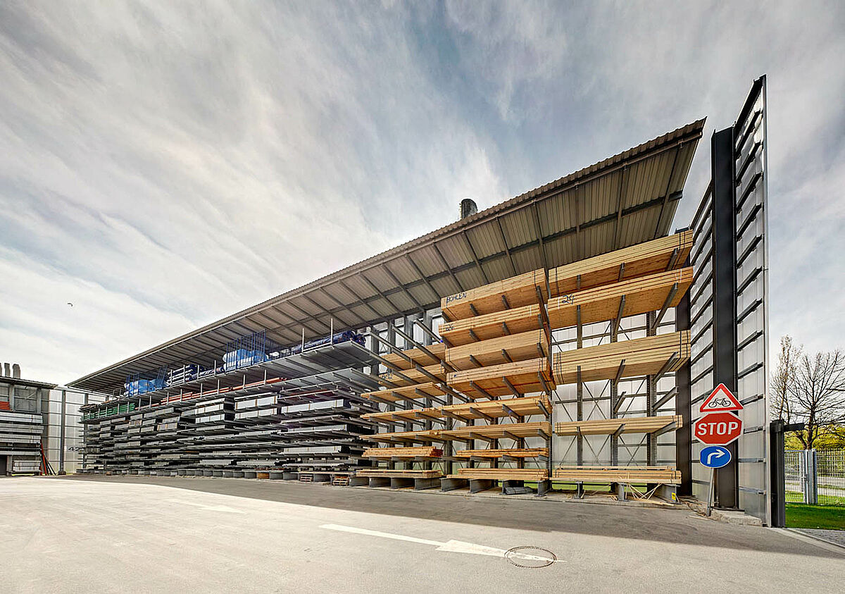 Tako so se npr. za zunanji prostor dobavili konzolni regali, zaščiteni z vročim cinkanjem. V regalih so našli svoj prostor vsi proizvodi kot npr. KG cevi, betonske plošče ali lesene deske. Konzolni regali so deloma pokriti in opremljeni z nosilnimi kovinskimi rešetkami. V tem primeru je bila tudi posebna zahteva po bočni poševno padajoči strešni konstrukciji zaradi poteka zemljišča.