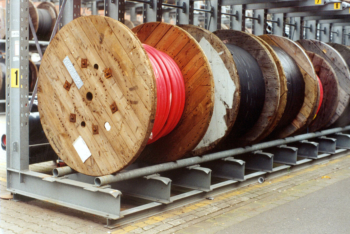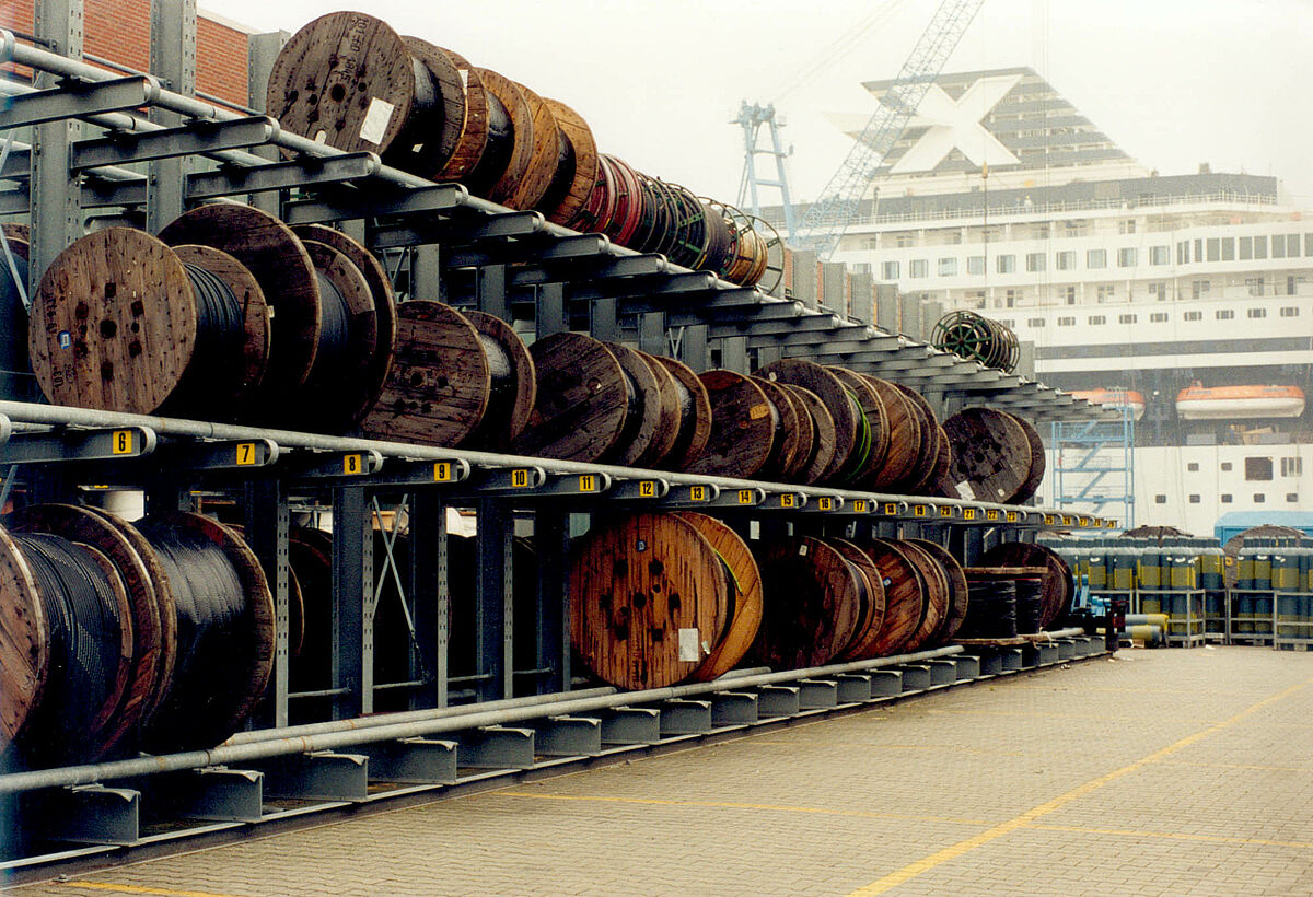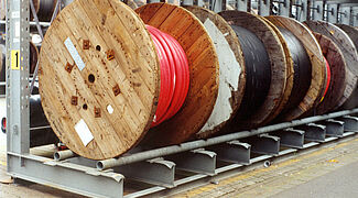 Optimalno skladiščenje kabelskih bobnov v robustnem OHRA konzolnem regalu. Bobni so različnih premerov in tež. Višina regala je 4.500 mm s koristno globino 1.400 mm in 1.200 mm, glede na premer bobnov.