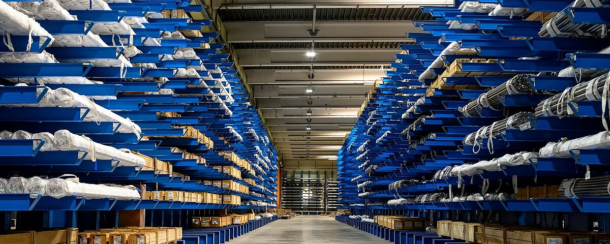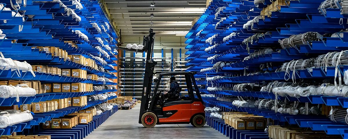 Zato je bila uporaba viličarja podlaga za zasnovo novega skladišča za dolgi tovor: hladno in nerjaveče jeklo se v konzolnih regalih skladišči kot dolg tovor z dolžinami snopov od 3 do 6 metrov. Tako lahko viličar hitro in natančno doseže posamezne artikle. V uporabi so standardni pettonski viličarji, ki lahko zlahka premikajo tovor s 4 tonami. V vsak predelek regala je treba naložiti takšen tovor, kot ga lahko naložimo na viličar, da tako zagotovimo preprostost postopkov. Za varno dosegljivo višino dviga je Wiedmann določil 5,5 metra.