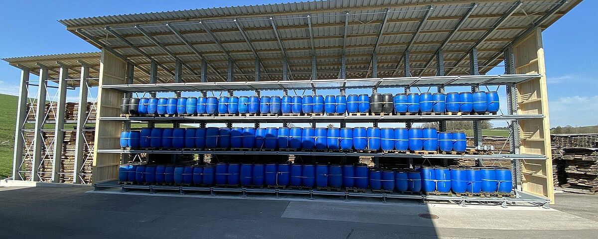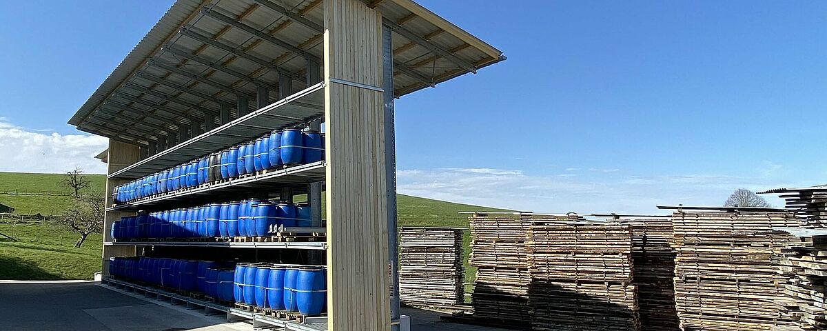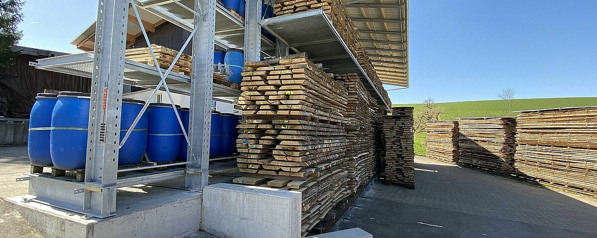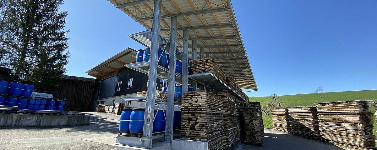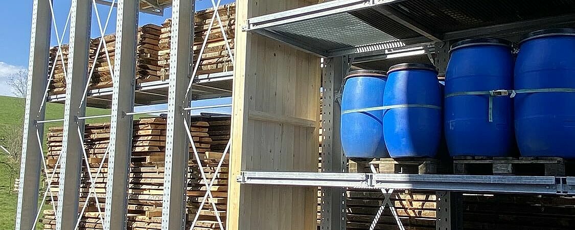 Zato se je podjetje Nyfeler odločilo, da učinkovitost skladišča bistveno poveča s konzolnim regalom podjetja OHRA. Predvideni prostor je zahteval individualno prilagojeno konstrukcijo: zaradi terena je bila namreč podlaga ene strani dvostranskega regala 1,5 metra nad drugo stranjo. Poleg tega konstrukcija ni smela ovirati tovornih vozil pri manevriranju na omejenem zemljišču. In nenazadnje je bilo treba zagotoviti prostor za najrazličnejše izdelke: skladovnico desk višine najv. 4,4 metra in dolžine najv. 5,5 metra ter sode, vreče in druge artikle.