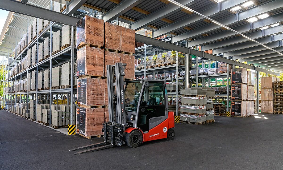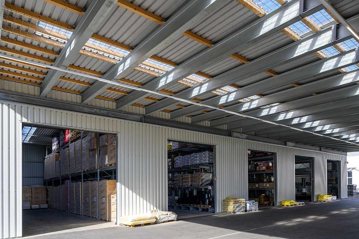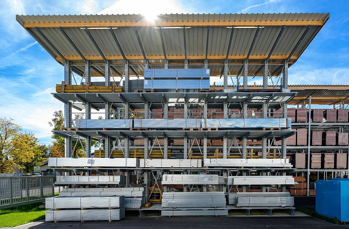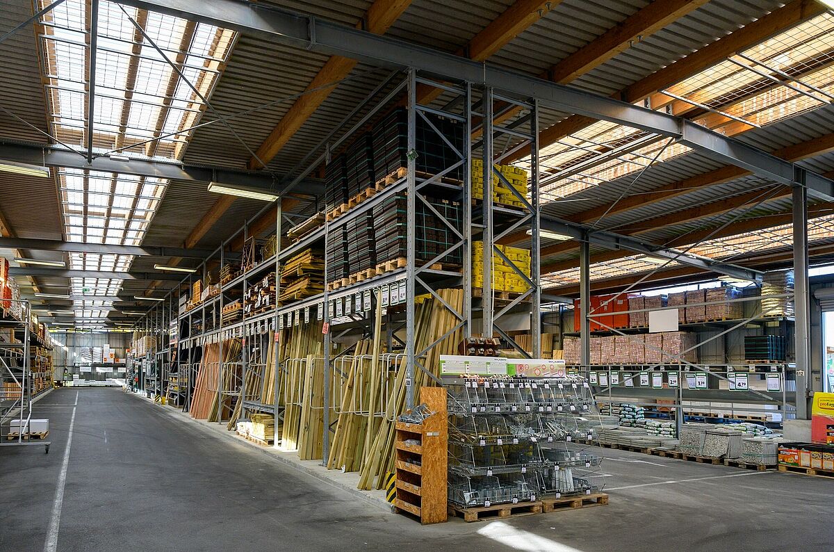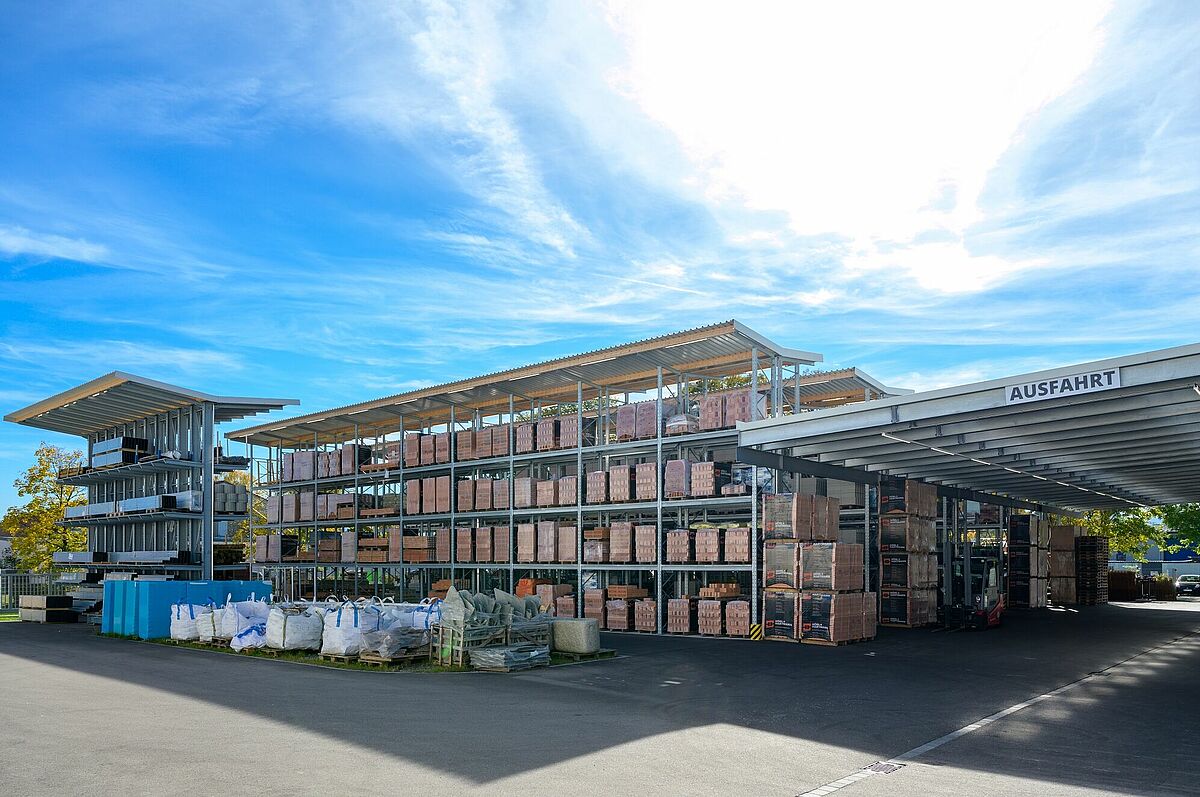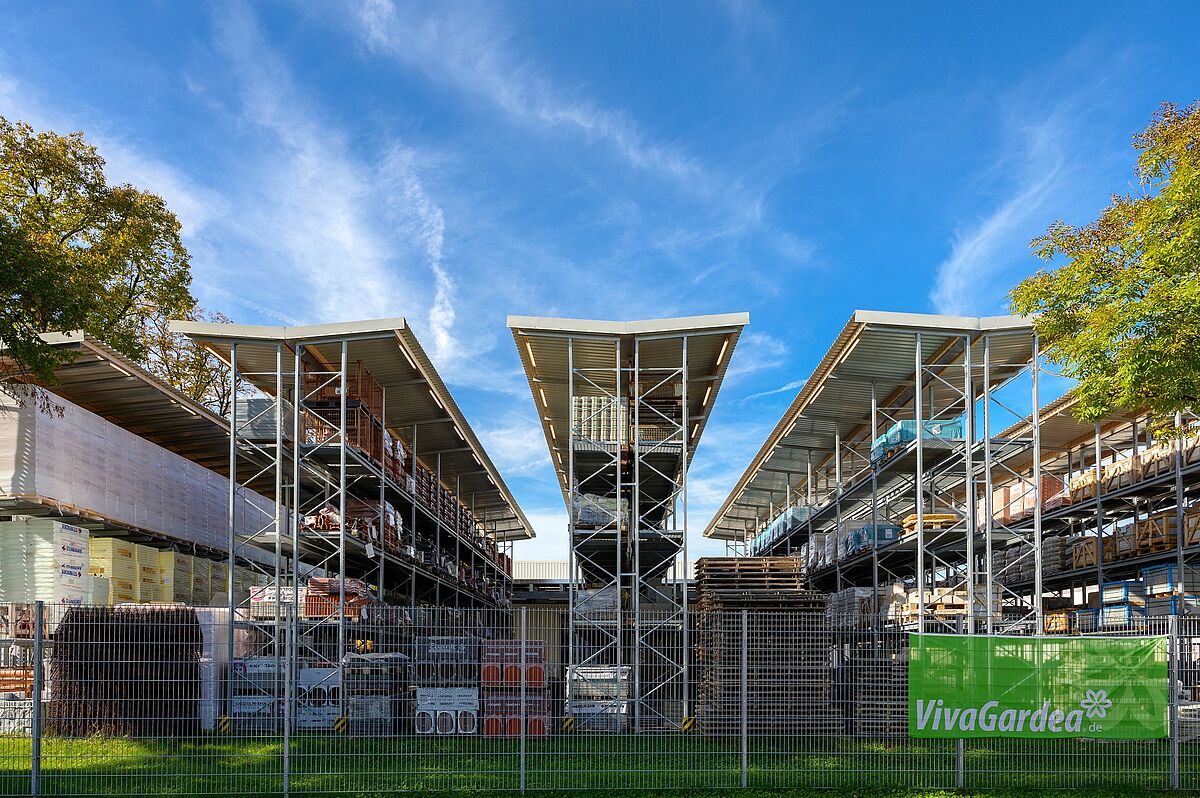 Udobno se lahko zapeljete neposredno do želenega blaga in ga naložite – zasnova trgovine vrste »drive-in« olajša nakup zlasti večjega in voluminoznega blaga, kot so (vrtni) gradbeni materiali ali vrtni les. Podjetje Schneider ta pristop uporablja tudi v specializirani trgovini. Stranke lahko ob vsakem vremenu potrebno blago udobno prevzamejo na pokriti tripasovni nakladalni površini. Podjetje OHRA je halo izvedlo v obliki regalne hale: pri tem so stebrii regalov hkrati uporabljeni kot nosilna podkonstrukcija za gradnjo hale. Čas projekta je zato krajši in zagotavlja precejšnje stroškovne prednosti. Regalno halo dopolnjujejo konzolni in paletni regali na prostem, kjer je blago zaščiteno pred vremenskimi vplivi z vgrajeno streho. Obe območji povezuje 13 metrov široka streha. Poleg tega je podjetje OHRA namestilo ogrevano halo, ki je zaščitena pred zmrzaljo in v kateri poleg pisarniškega prostora tudi varno skladiščijo gradbene kemikalije in talne obloge.