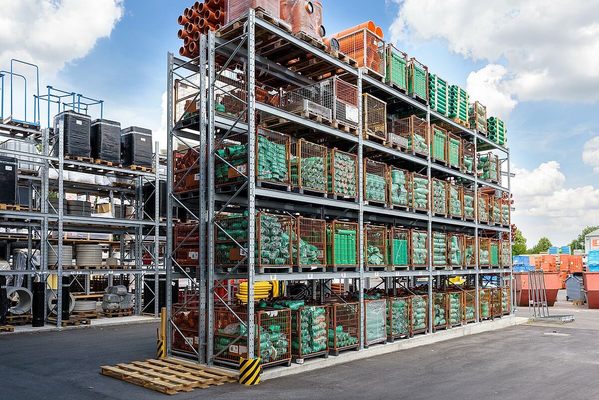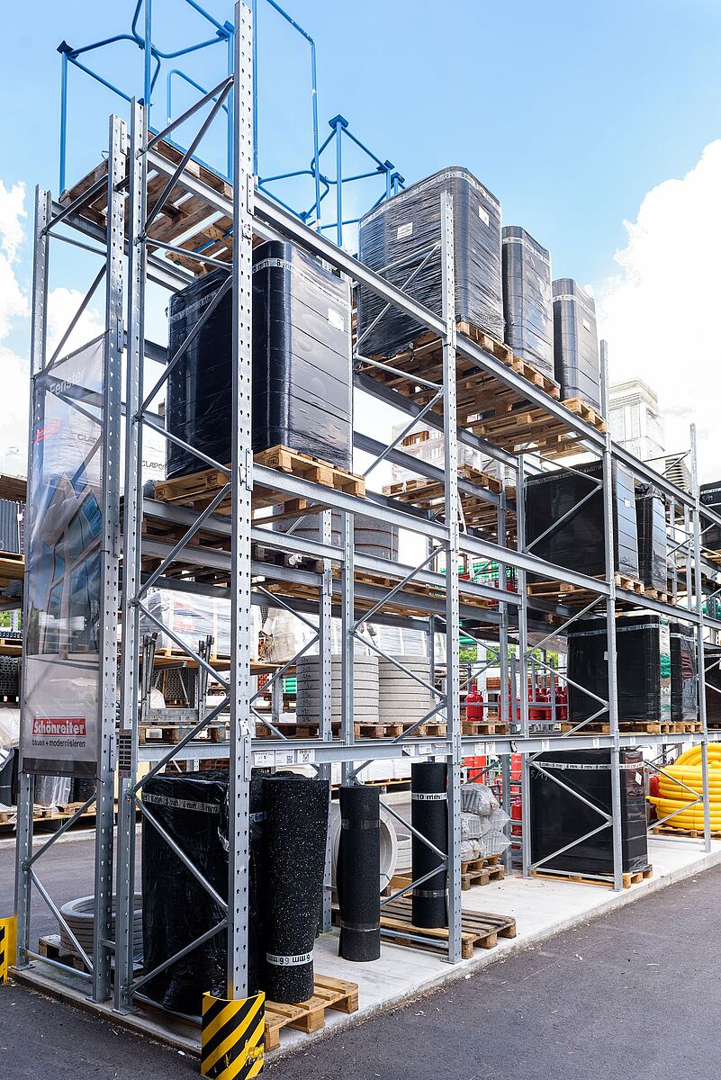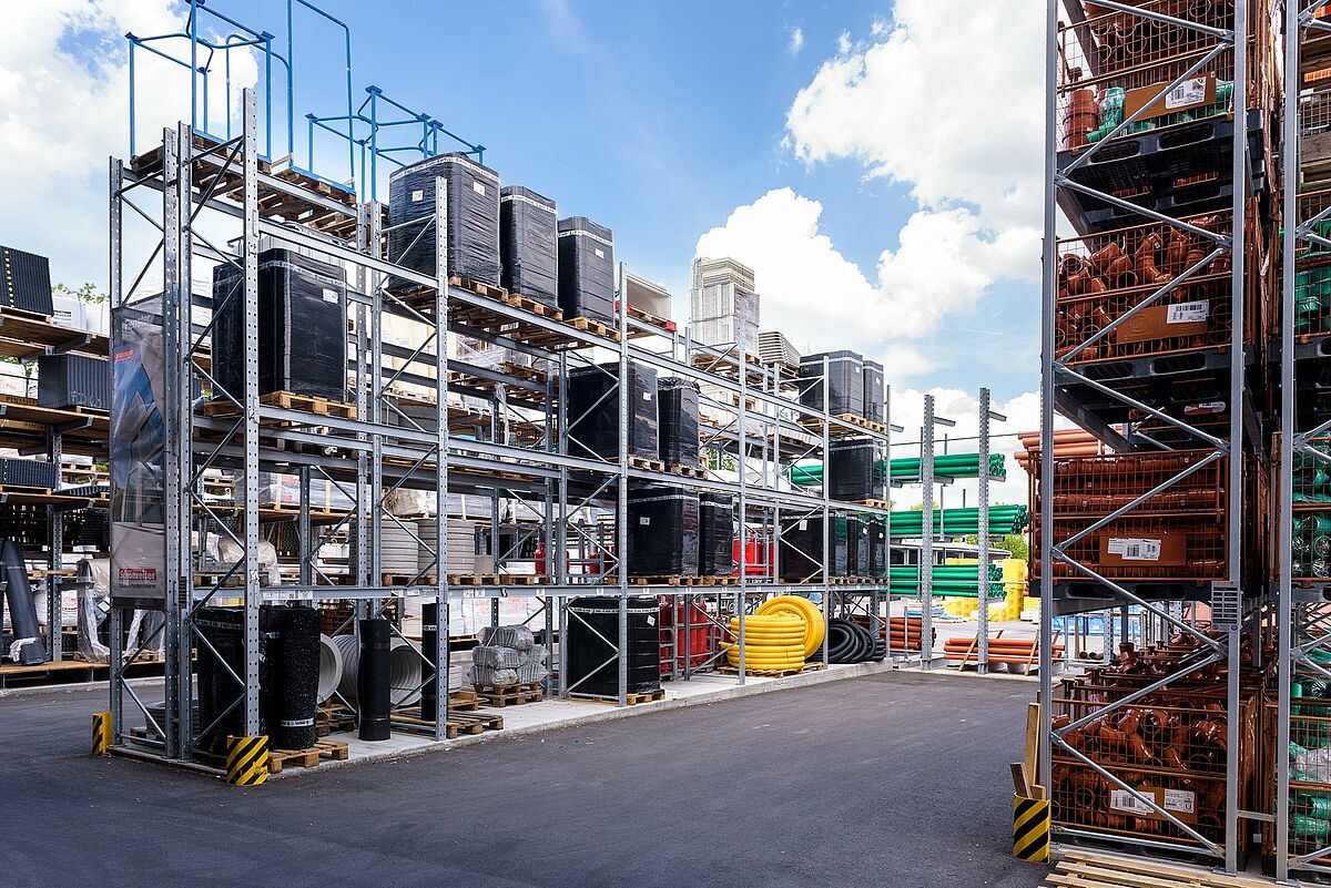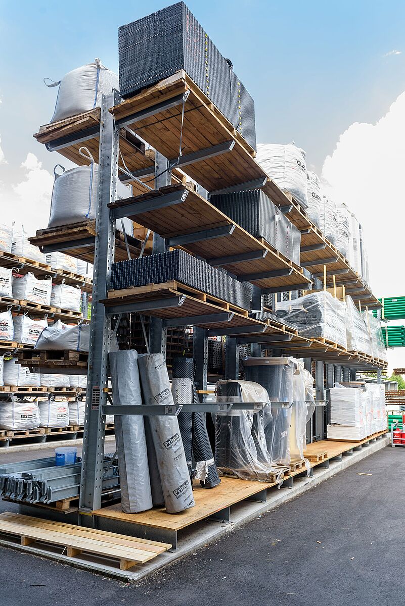 Podjetje se je pri tem odločilo za kombinacijo konzolnih in paletnih regalov: tako je mogoče prilagodljivo skladiščiti najrazličnejše izdelke. Pri tem so regale prilagodili zahtevam glede na točno določeno ponudbo. Tako je na 7510 milimetrov visoke konzolne regale na petih skladiščnih ravneh mogoče naložiti na primer tri palete izolacijskega materiala drugo nad drugo. Težak tovor na evropaletah je zahvaljujoč nosilnosti do 4500 kilogramov mogoče brez težav skladiščiti v paletnih regalih.