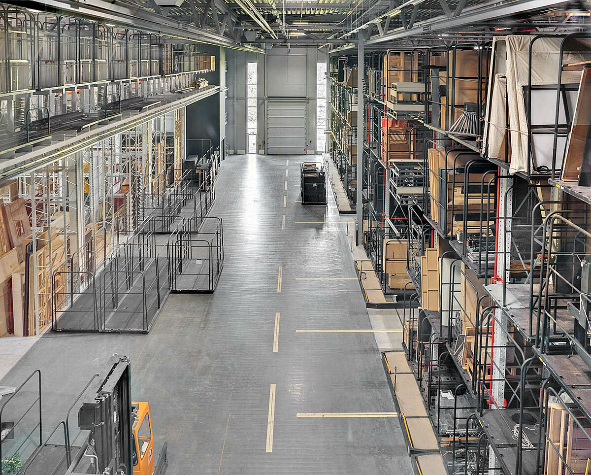 V 20. vrstah, dolžine skoraj 60 m in višine 12 m, se lahko na transportnih vozičkih skladiščijo kulise različnih velikosti in dimenzij.