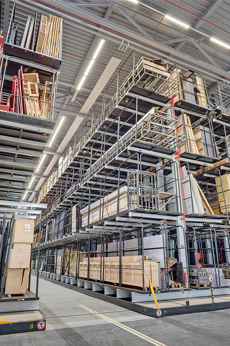 8 prevoznih dvostranskih konzolnih regalov, dolžine skoraj 60 m, imajo skupno nosilnost 180 t. Vstavljanje in odvzemanje kulis iz regalov poteka s štiripotnim viličarjem, na katerem je montirana kabina za višinsko vožnjo.