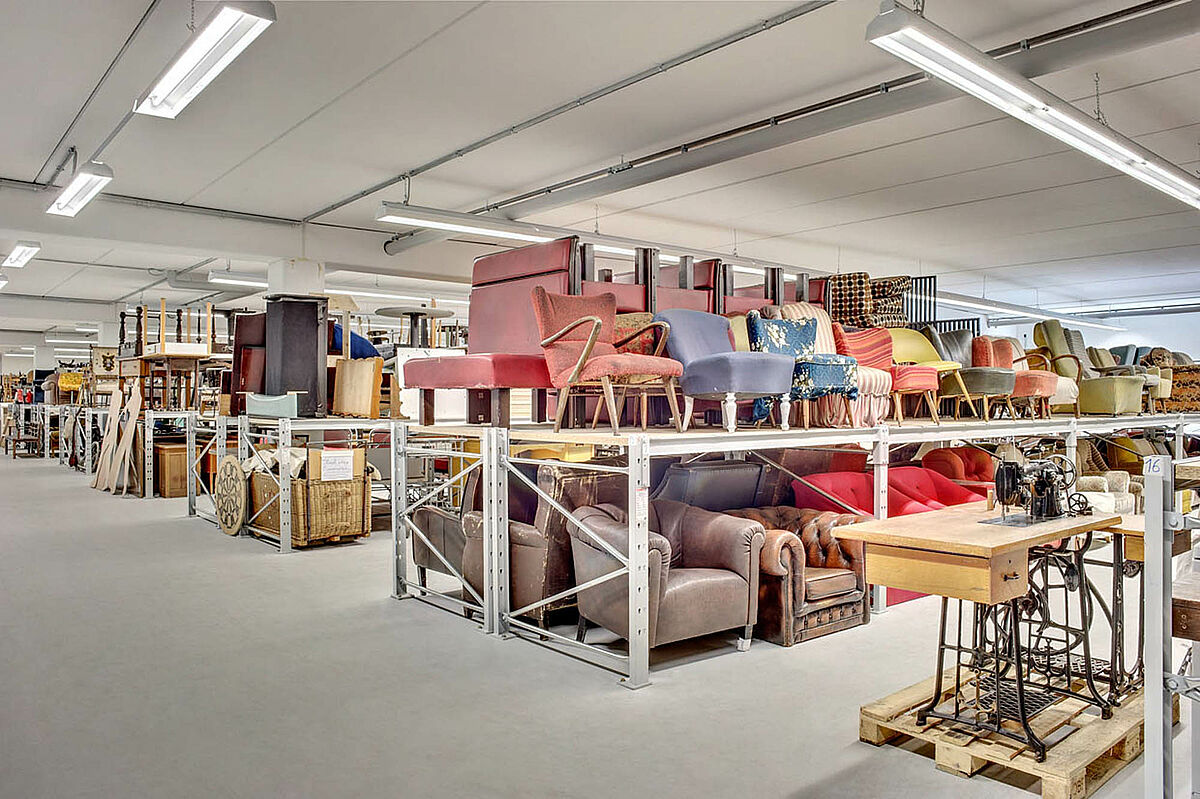 V sosednji trinadstropni hali se skladiščijo drugi rekviziti, kot pohištvo, luči, dekoracijski pripomočki in tako naprej. Ena kompletna etaža je rezervirana za kostume, čevlje in dodatke. Ni čudno, da so na skupni dolžini 2.400 tekočih metrov tesno eden poleg drugega obešeni kostumi. K tem pridejo še regali za čevlje, klobuke in drugo opremo.