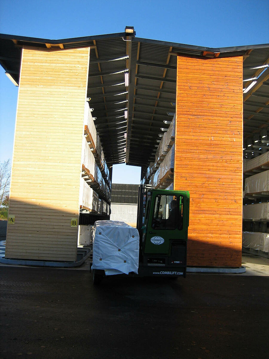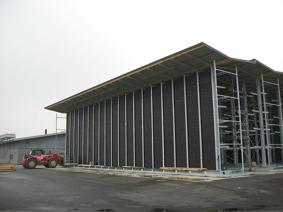 Neobdelani leseni paketi so se v preteklosti skladiščili na prostem. Zato je bil potreben velik zunanji prostor in rokovanje je bilo dolgotrajno. Stranka je zato hotela ustvariti možnost skladiščenja v neposredni bližini proizvodne hale. Istočasno naj bi novo skladišče postavili na ozkem prostoru, da bi se stroški glede betonske plošče in strešne površine maksimalno zmanjšali. Poleg tega naj ne bi bila v primeru razširitve v prihodnosti potrebna adaptacija.