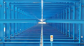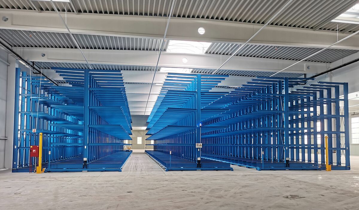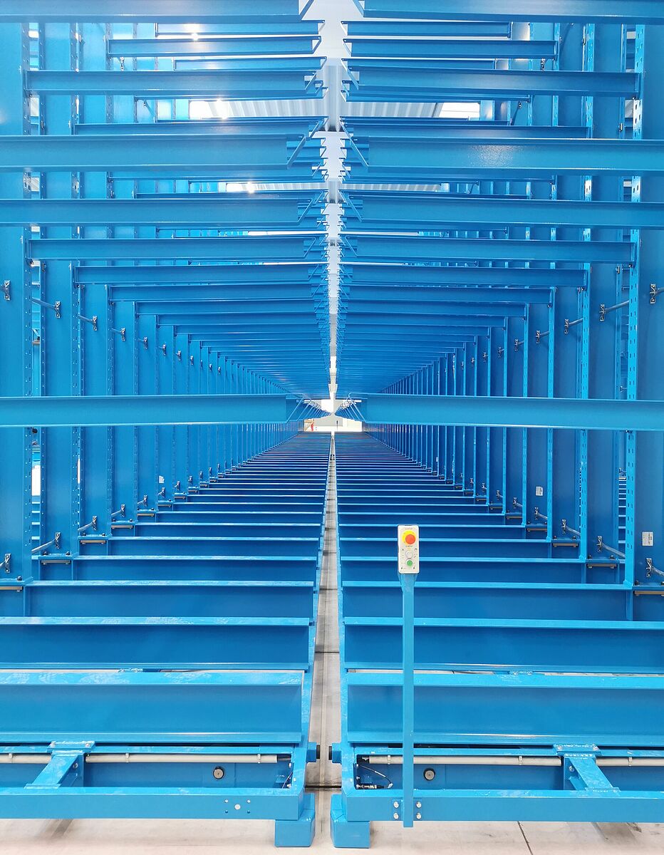 V hali so trije enostranski konzolni regali, ki so trdno nameščeni na tla, ter trije dvostranski regali, ki so nameščeni na pomičnih vozičkih. S pomikanjem vozičkov do kompaktnega skladiščnega bloka je vedno odprt zgolj en hodnik za upravljanje s štiripotnim viličarjem – tako je prostor vedno izjemno dobro izrabljen. Vsak od pomičnih regalov je dolg skoraj 50 metrov in visok 6,5 metra. Pet skladiščnih ravni je sestavljenih iz 2,1 metra dolgih regalnih konzol, vsaka od njih pa ima nosilnost do 800 kilogramov. Skupno je tako vsaka šasija obremenjena z do 528 tonami. Kljub tej obremenitvi se pomični vozički pomikajo s hitrostjo približno 4 metre na minuto – tako ni treba dolgo čakati, da se 4,59 metra širok prehod odpre.