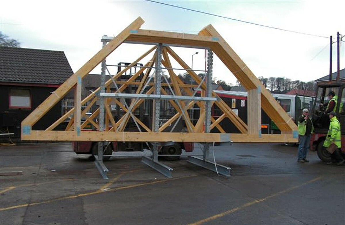 Walker Timber Ltd, specializiran izdelovalec strešnih nosilcev in lesenih konstrukcij, s sedežem v Bo’ness, v bližini Edinburga (Škotska), je potreboval skladiščni sistem za nove strešne grede. Te naj bi varno skladiščil na zunanjem prostoru, do odvoza s kamioni.