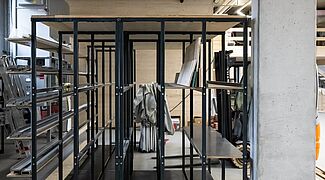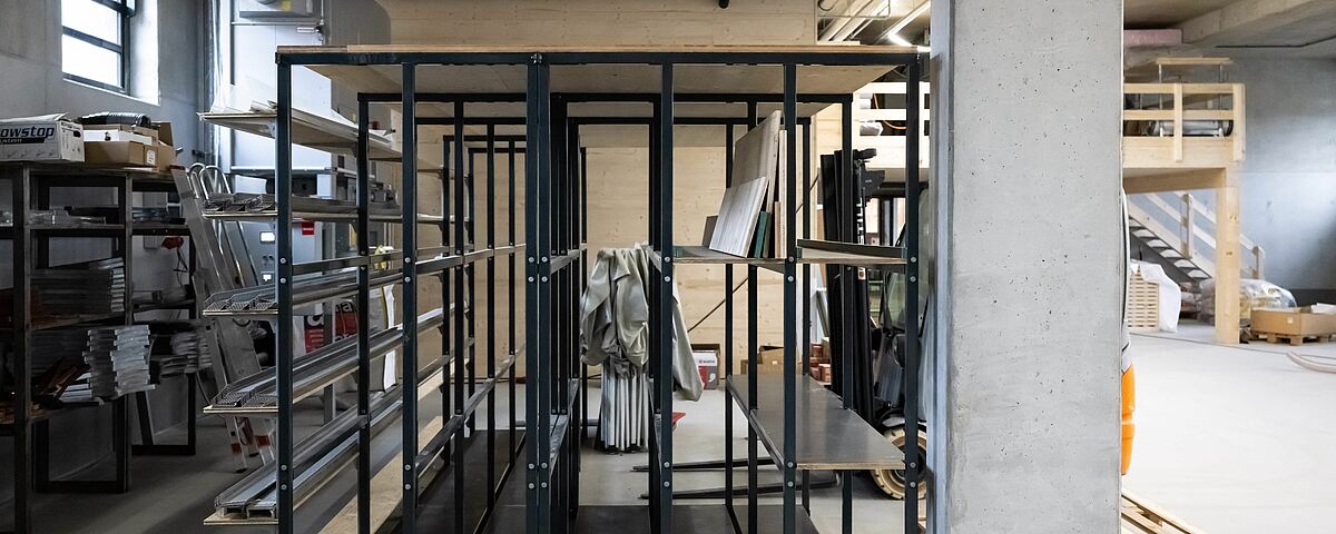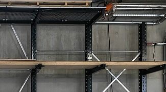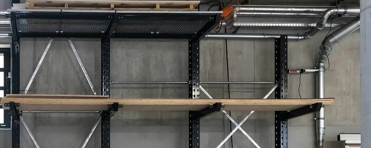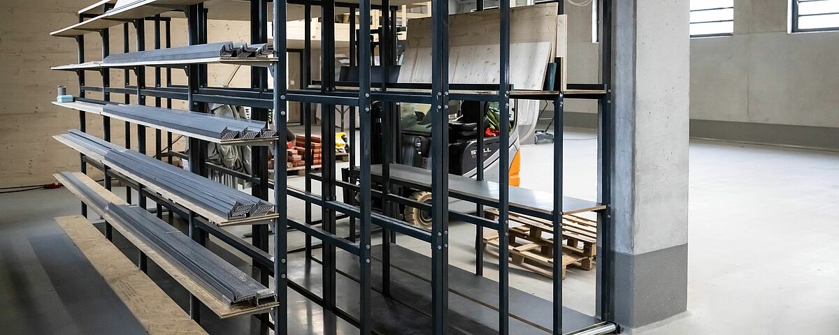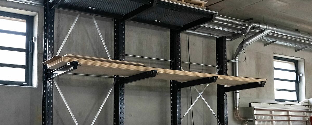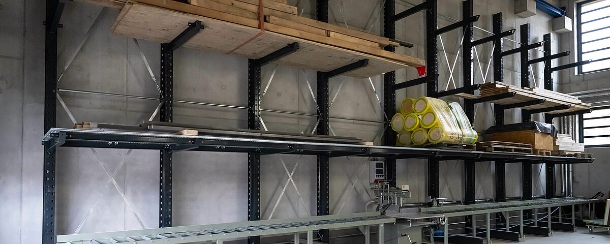 Regalni sistem, zasnovan za novo skladišče, je sestavljen iz skoraj 16 metrov dolgega vroče pocinkanega konzolnega regala za uporabo na prostem. V notranjem prostoru sta bila nameščena 15 metrov dolg in tri metre dolg konzolni regal. Približno sedem metrov visoki konzolni regali ponujajo bistveno večjo skladiščno zmogljivost od skladiščenja na tleh in precej nižjih konzolnih regalov, ki so jih uporabljali na prejšnji lokaciji. Regalne konzole, ki lahko nosijo do 1000 kilogramov, so bile delno opremljene tudi z mrežastim dnom in mostovi. To pomeni, da je na regale mogoče shraniti najrazličnejše vrste lesa, artiklov in palet. Poleg tega je mogoče višino posameznih nivojev shranjevanja zelo poljubno prilagajati zaradi prosto obešenih regalnih konzol. Za shranjevanje plošč različnih velikosti sta bila nameščena dva dodatna vertikalna regala, v katerih so plošče shranjene navpično – tako da je mogoče hitro in enostavno dostopati do želene plošče. Vsi notranji regali so bili na zahtevo podjetja »Ihre Zimmerei« prašno lakirani v privlačni antracitno sivi barvi (RAL 7016).